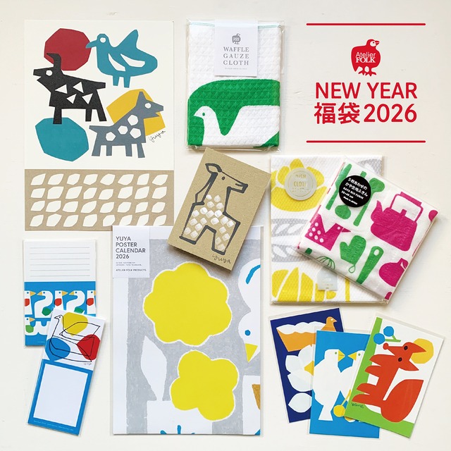 ご好評いただき毎年即日完売となる福袋が、2026年の元旦に登場!日々の暮らしで楽しめるアイテムがいろいろ入って、通常価格が約5,400円相当のところ3,790円(別途送料210円)のお得なセットです。YUYAデザインの絵や雑貨で楽しい一年をお過ごしください。 ⭕️プレゼントは直筆カード! 2026年の干支は馬。一枚一枚手描きした直筆の馬カード(原画)をプレゼントいたします。良い一年になりますように! また、アトリエ・フォークの年賀状も同封します。 ⭕️ポスターカレンダーをすでにお持ちの方向けオプション 神戸の個展で「ポスターカレンダー」をご購入いただきお持ちの場合「ガーゼタオルハンカチ」に変更可能です(柄は選べません)。ご希望の場合は、オプション欄から「ポスターカレンダーを持っているため、ガーゼタオルに変更する」の選択をお願いします。 *もしも、変更希望なのに選択し忘れて購入してしまった場合、購入後でも個別対応できるのでメール等で後からご連絡をください! ⭕️ご購入時の注意事項(個数制限など) *1回1個の個数制限あり。 (複数ご希望の際は再度ご購入ください) *予定数に達し次第終了となります。 *お支払いはクレジット決済またはキャリア決済。 (当店では銀行振込・コンビニ払い等にご対応できません) ⭕️発送について 1月2日(木)以降発送いたします。日本郵便クリックポストでお届けします(ポスト投函型・届くまで数日かかります)。 *発送の都合や、アトリエ冬季休暇によりお待たせする場合もあるかも知れませんが、ごゆっくりお待ちいただけますと幸いです! ⭕️セット内容 ------------------------------------------- ・新作:ポスターカレンダー2026 (A2サイズを4つ折でパッケージしています) ・新作:ワッフルガーゼのキッチンクロス「草原の鳥」 ・ダイヤ織ディッシュクロス(どれか1柄)*柄は選べません ・かや生地ふきん(どれか1柄)*柄は選べません ・ポストカード3枚(現行品から3柄)*柄は選べません ・昔のA4ポスター「民芸品と暮らす日々」 (デッドストック品!2012年頃の?) ・一筆箋「123の鳥(ハガキサイズ)」「鳥と音楽(縦長サイズ)」 ***プレゼント*** ・手描きドローイング原画「馬」ハガキサイズ ・アトリエ・フォークの年賀状 ------------------------------------------- *各商品の詳細は、個別の商品販売ページをご覧ください ⭕️他商品の同梱について 他商品を同カートに追加しての購入も可能です。ご購入金額が8000円を超える場合は送料無料となります。